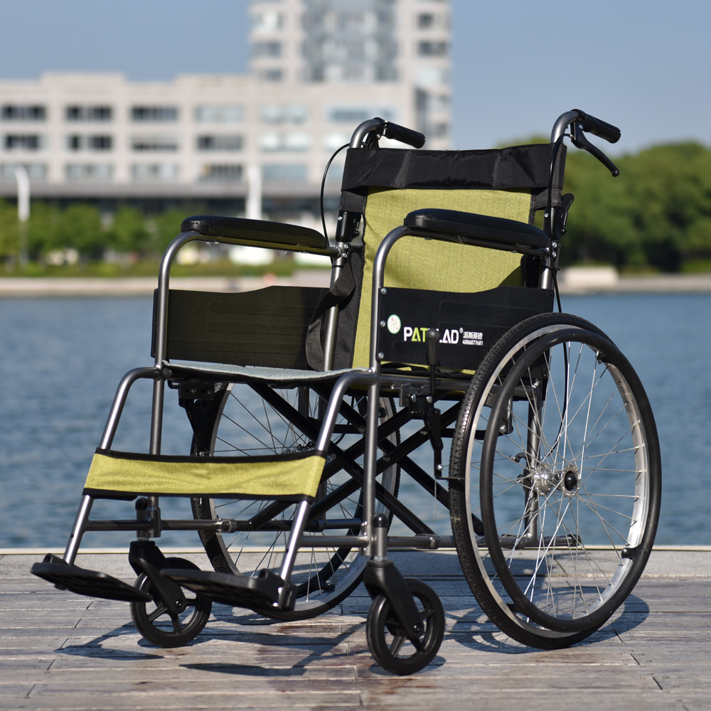 派斯莱德6011铝合金轻便手动轮椅车,整车仅重12kg,22英寸辐条后轮,双色牛津布,双刹车,可折背。