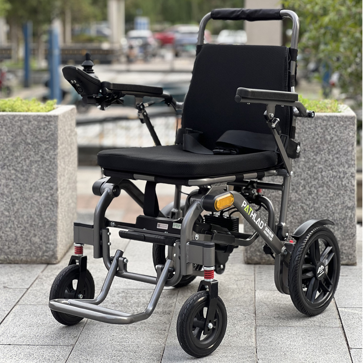 派斯莱德60221轻便款电动轮椅,整车含电池20kg,带拉杆,方便拖行,液晶无刷控制器,集成USB充电,LED照明灯。